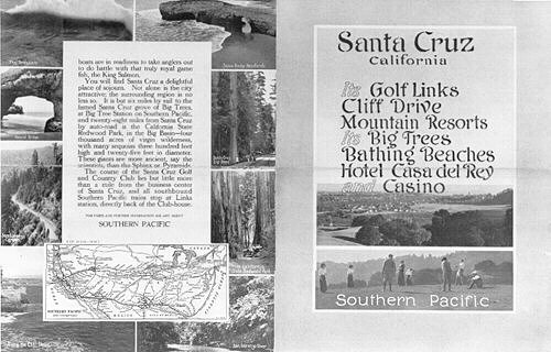 boats are in readiness to take anglers out to do battle with that truly royal game fish, the King Salmon. You will find Santa Cruz a delightful place of sojourn. Not alone is the city attractive; the surrounding region is no less so. It is but six miles by rail to the famed Santa Cruz grove of Big Trees, at Big Tree Station on Southern Pacific, and twenty-eight miles from Santa Cruz by auto-road is the California State Redwood Park, in the Big Basin--four thousand acres of virgin wilderness, with many sequoias three hundred feet high and twenty-five feet in diameter. These giants are more ancient, say the scientists, than the Sphinx or Pyramids. The course of the Santa Cruz Golf and Country Club lies but little more than a mile from the business center of Santa Cruz, and all southbound Southern Pacific trains stop at Links station, directly back of the Club-house. | |