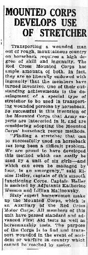 Transporting a wounded man out of rough, mountainous country on horseback requires a high degree of skill and ingenuity, The Red Cross Mounted Corps has ample amounts of both. In fact, they are so liberally endowed with ingenuity that the members have turned inventive. One of their outstanding achievements is the development of a special type of stretcher to be used in transporting wounded persons by horseback. So successful is this invention of the Mounted Corps, that Army experts are interested in it, and are considering adopting the Mounted Corps' horseback rescue methods. "Finding a stretcher that can be successfully used on horseback has long been a difficult problem. We are proud to have developed this method which can easily be used by a unit of six girls--and which can even be managed by four, in an emergency," said Eloise Heller, captain of this smooth functioning Corps. Captain Heller is assisted by Adjutants Katherine Wesson and Lillian Malinowsky. Sixty expert horsewomen make up the Mounted Corps, which is an Auxiliary of the Red Cross Motor Corps. All members of this unit have passed standard and advanced First Aid tests as well as horsemanship tests. The purpose of the Corps is to find and transport wounded in the event of accident or warfare in country which cannot be reached by motor. |